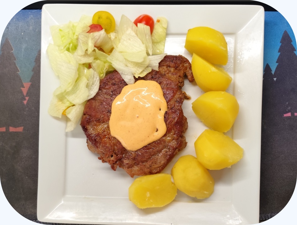 Ja verkligen,vad ska jag ha på dagens tallrik?? ja det var frågan.Kollade i skåpet om det fanns något att starta med..Där låg ett par stekta falukorvskivor som inte fick plats på lunchmackan,några champinjoner bacon och minitomater,kan det bli något..Fixade till lite pulvermos som piffades upp med ett ägg.Lindade bacon runt svampen som fick fräsa i stekpannan…Tog fram en planka och placerade baconsvamparna på den,spritsade på moset,lite tacosås,lade på de 2 falukorvbitarna,in i ugnen225* 15 min..minitomater och i glaset vatten..