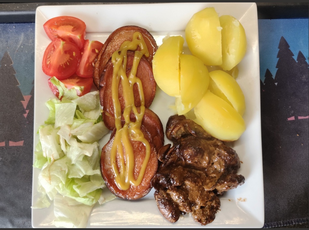 Idag blev det skåprens på tallriken,jag kollade vad som fanns,en liten bit Falukorv,några Champinjoer som såg lite molokna ut,även lite grönt isbergs och tomater.Oki,det duger,kokade lite potatis och satte fart på stekpannan.På tallriken så såg det riktigt smarrigt ut..