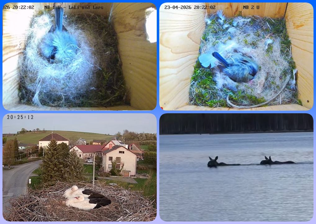 Här kommer ett svep över de olika ställen som jag har koll på..Storkarna i Tjeckien där är inget nytt..Fiskgjusen Maya ligger trygg på de 4 äggen..I Ångermanland är nu älgarna på gång,här 3 st på väg in i entrén..Hornugglan i Ungern,brer ut vingen för att skydda sin ägg och ungar 3 av 7 ägg kläckta..I Tyskland är det bara i Blåmesens holk nr 2 som det hänt något,nu ligger 9 ägg i boet.Ska scrolla tillbaka lite och kolla.