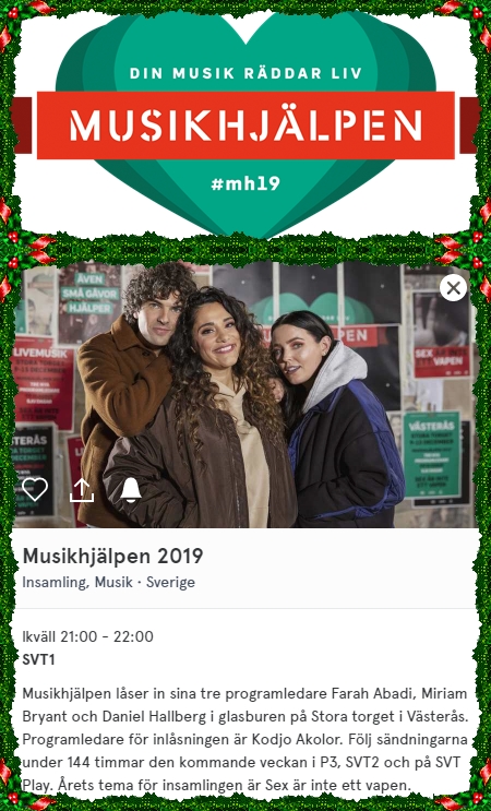 Musikhjälpen har jag kollat och bidragit till nu i några år.Temat för hjälpen är i år viktigare än någonsin.”Sex är inte ett vapen”.Ringde igår till barnbarnen och frågade om jag fick skänka deras månadspeng som dom fått nu i några år,till Musikhjälpen.Svaret kom blixtsnabbt.”Farfar det är helt Okay” det är jättebra.Deras peng har varit/är 100:- i månaden,mitt bud till barnen löd. Jag lägger samma summa som ni..Så tillsammans har vi nu lagt 400:- säger tack underbara ungar.Kram.