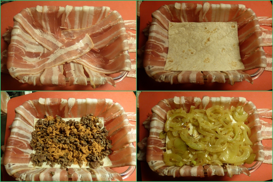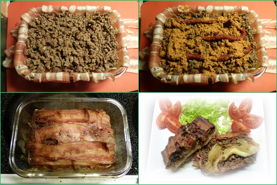 Plockade fram Köttfärs,Bacon,Tortillabröd mjuka,Lök,Tacokrydda,Riven ost och Tomatpuré..Hur jag skulle gå tillväga det var kristallklart.Det skulle bli en ugnsrätt.Skred till verket i 16 tiden,skivade löken som jag fräste på,tog den åt sidan,fräste sedan på köttfärsen kryddade på med salt timjan och svartpeppar, klippte till tortillabröden i lagom stora bitar för ugnsformen. Klädde in formen med bacon,gick åt 2 pkt,lade sedan ett tortillabröd,sedan lite av köttfärsen, strödde på lite tacokrydda,ett bröd till ovanpå färsen,på med riven ost och den stekta löken,ett bröd till och köttfärs,lite tomatpuré och tacokrydda.Vek sedan över baconet.In i ugnen 200* i ca 20 min,kollade nja lite till,täckte med en folie och lät det stå inne ytterligare 10 min.Lite grönt på tallriken och en gentleman i glaset..Blev faktiskt inte så tokigt.Blev bra drag med tacokryddan.