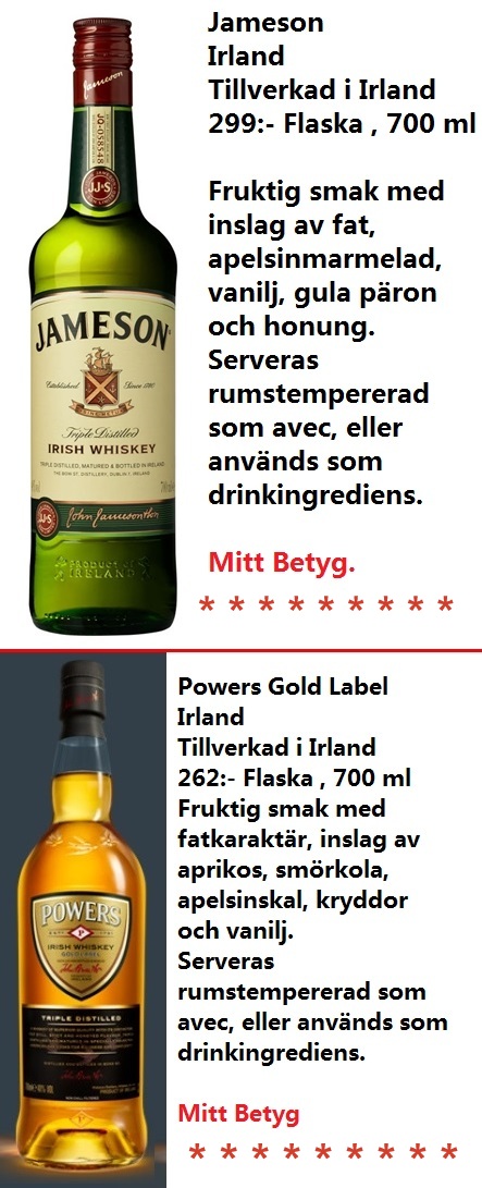 Fortsätter här med mina Whisky intryck genom åren,jag har ju smakat på ett ganska stort antal,med varierande smakupplevelse.Jamesons var min favorit ända till den dag då jag smakade Tullamore DEV för första gången. Här nedan två Irländare med ganska lika smakprofil.. Powers Distillery grundades i Dublin 1791. I början såldes whiskeyn direkt från fat. Powers blev dock det första destilleriet på Irland att tappa whiskey på flaska för att kunna garantera dryckens kvalitet.