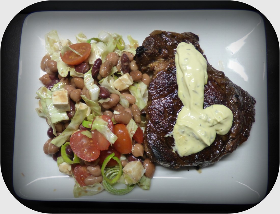 Hade en entrecote i frysen som jag tog fram i morse..Stekte den när det blev matdags.Medan den småputtrade så tog jag fran en frp blandade bönor som jag spolade av i kallvatten,ner i en skål,skar ner lite spetskål,tomat,purjo och fetaost.Rörde ihop en dressing av olivolja,vinäger,senap och lite salt som jag slog över i skålen,smakade av,lite balsmico fick gå med också..Riktigt gott.
