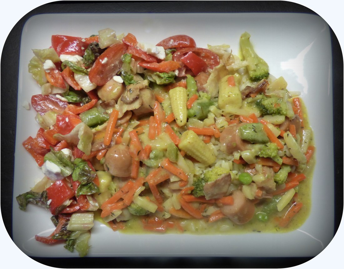 Det kanske inte ser ut som världens vackraste rätt,,men faktum är att det blev förbaskat gott..Jag skar ner 3 grillkorvar och 1 pkt bacon i bitar,fräste på i wookpannan,kryddade med salt,peppar,shiliflakes och curry.Slog i wookgrönt Thai,,avslutade med en burk kokosmjölk.Det fick koka ihop några minuter,avslutade med lite maizena för lite krämigare konsistens.På tallriken en grönsallad med fetaost..Riktigt läckert säger jag..Faktiskt.