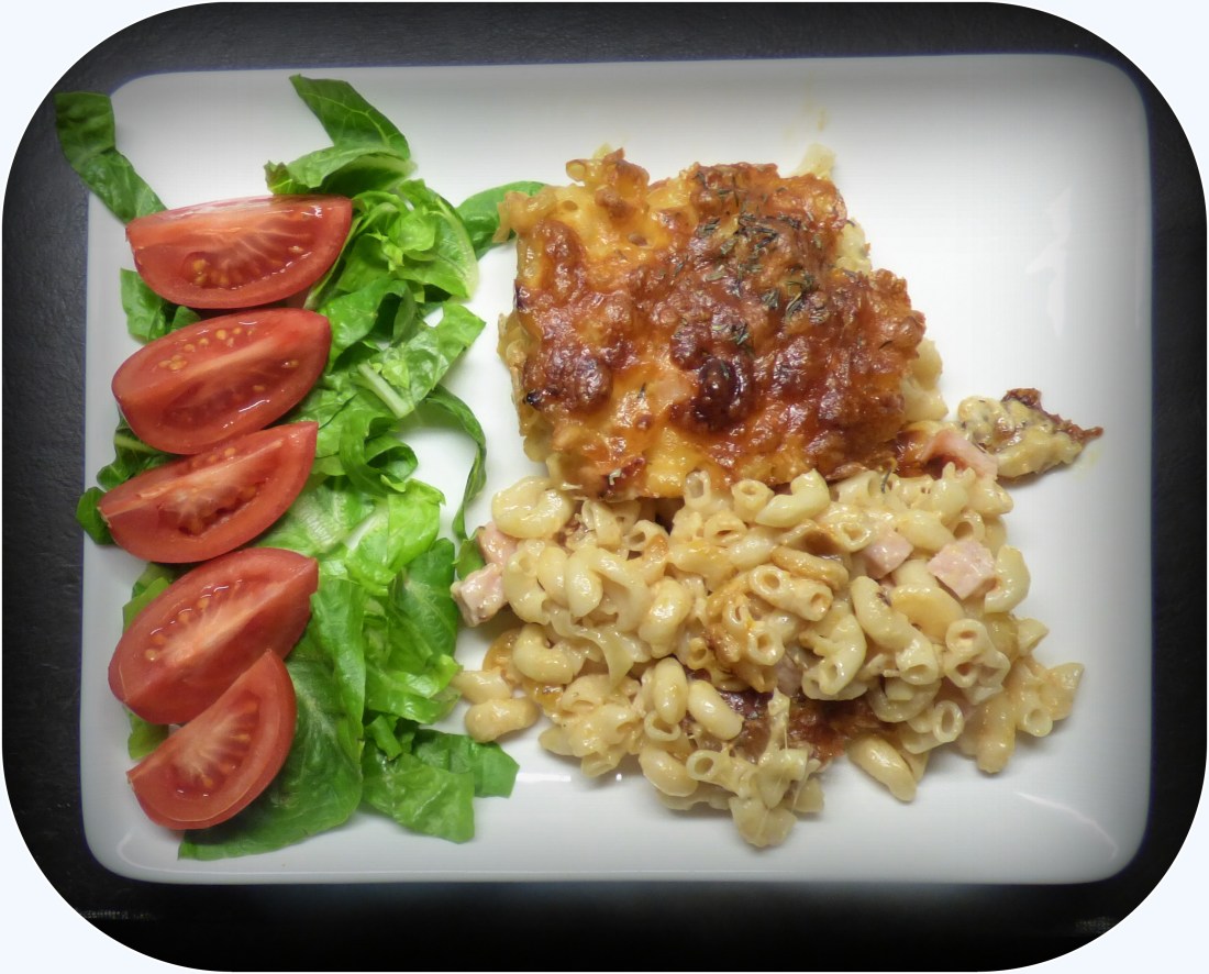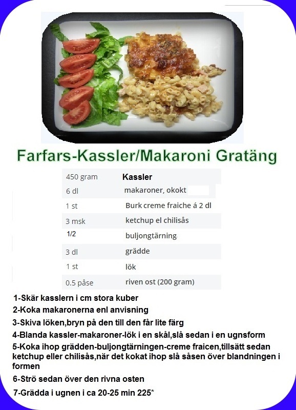 Fick en matidé när vi pratade mat,polarn o jag,så jag köpte en bit kassler på hemvägen..Det blev en Kassler/Makaroni Gratäng..Hur jag gjorde kommer nedan,jag glömde skriva i salt o peppar..Men lovar det smakade bra,som vanligt lite grönt på tallriken,i glaset en Tjeck,,Breznak.Blev 3 lådor också.