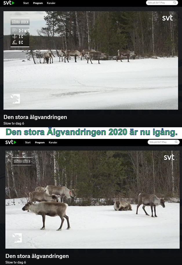 Nu är årets satsning på denna naturupplevelse igång sedan 6 dagar,än har jag inte sett någon älg,däremot ett antal Renar och lite fåglar..Har du inget speciellt för dig så rekomenderar jag att du kollar på SVT Play,där sänder man dygnet runt,man har 28 kameror som bevakar ett stort område i Junseletrakten.. Länken= Se sändningen här i SVT Play.