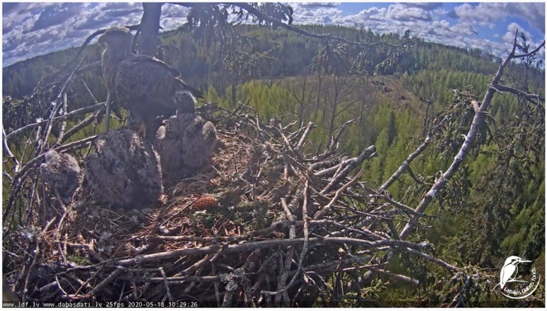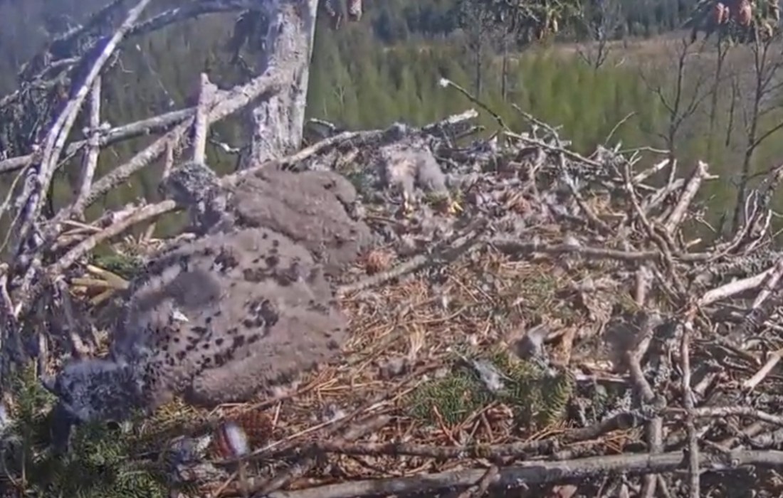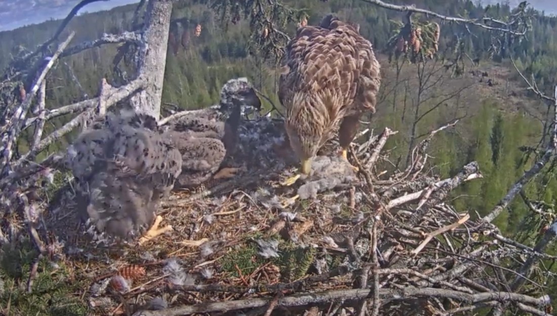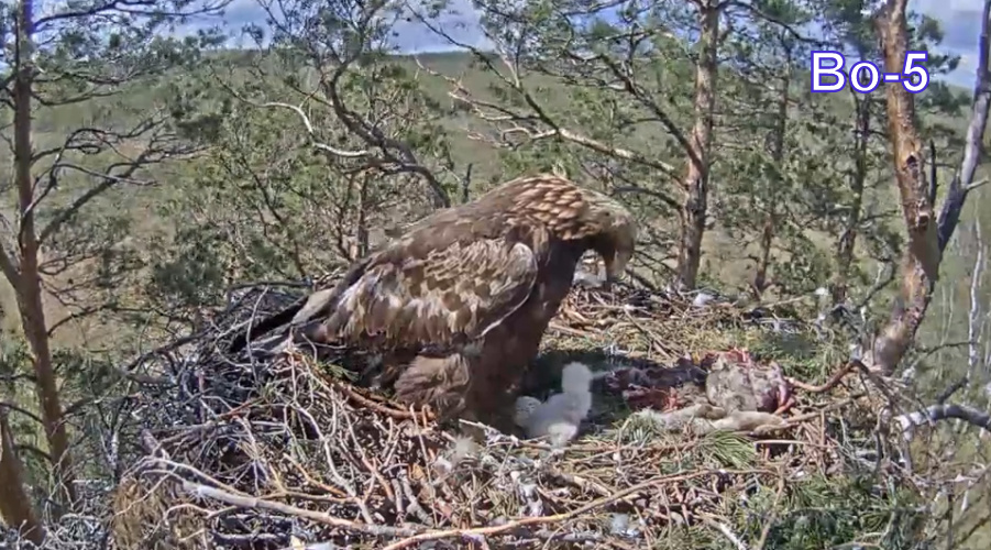 När jag kikade in tidigare så kunde jag inte se lille Benjamin,läste i kommentarena att han hade blivit knuffad ur boet av ett syskon.Mamma örn som jag ser är döpt till Vilma,kom flygande till boet med Benjamin i klorna,tyckte han visade livstecken,men mamma avlivade honom.Det som var det sorgligaste att se,det var att hon matade de andra två med Benjamin..Så att naturen är grym,det är helt sant..