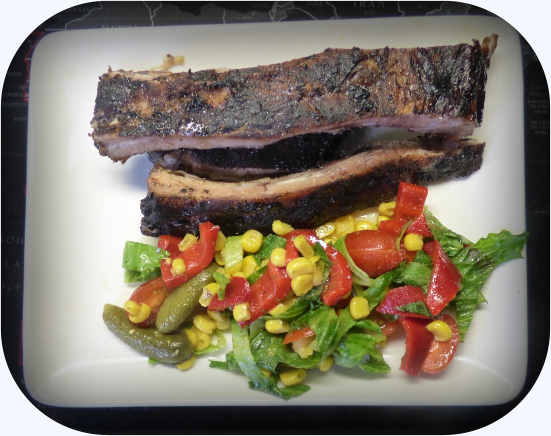 Efter ca 1:40 min i ugnen så tog jag ut spjället ur ugnen,jag hade skurit ner lite olika grönt.På tallriken blev det spjäll och den rödgröna röran,riktigt smarrigt blev det,det är väl tur att man får äta spjäll med händerna,bästa besticken.I glaset hade jag en röd italienare,passade utmärkt..