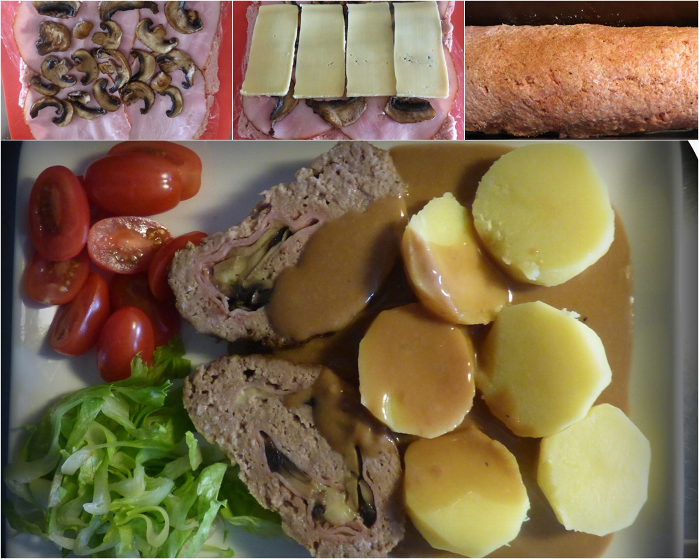 Köttfärslimpa platsar väl under den rubriken,tycker jag..Jag hade blandfärs i en bunke,ca 5 hg,i med ett ägg,1 dl creme fraice,1 msk soya,salt/peppar,rörde ihop,plattade ut färsen till en rektangel på lite plastfolie,kryddade på med lite grillkrydda,lade på några skivor rökt skinka,lite stekta skivade champinjoner och några ostskivor.Rullade ihop,lade rullen i en form,körde sedan i ugnen 200* i ca 40 min.Fixade till en sås under tiden,kokade potatis..På tallriken blev det lite grönt.Smakade riktigt bra..