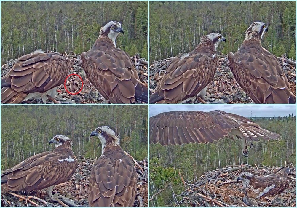 Därefter så matade hon de tre ungarna,när dom var mätta så lade hon sig ner med ungarna under sig.Pappan drog då från boet.