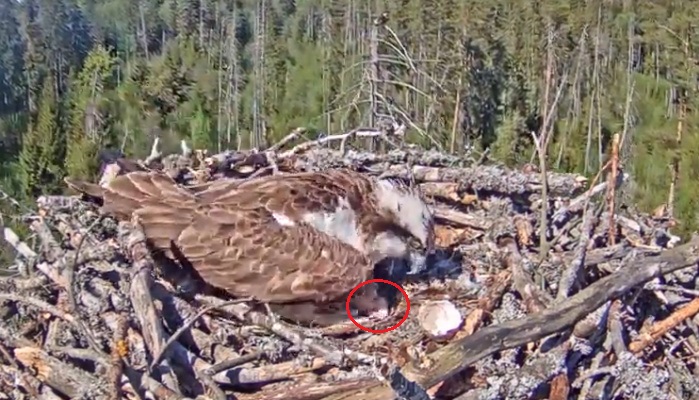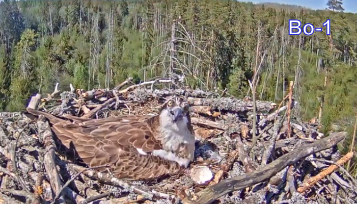 Så kom det en unge i Bo 1 efter 37 dagars ruvning,första tecknet på detta var när jag fick se ett halvt äggskal som mamma gjuse lade upp på sidan av boet..