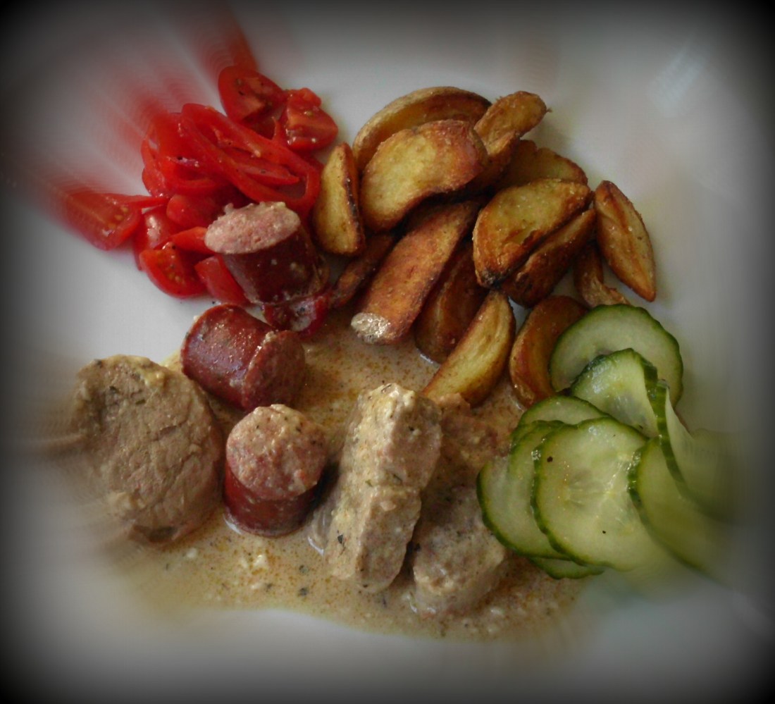 Idag bjöd sonen på en riktigt god gryta med fläskfilé och lammkorv, potatisklyftor,pressgurka och en syrlig sallad av tomat och paprika i glaset en god Italienare Amicone,en kombo som gifte sig jättebra.