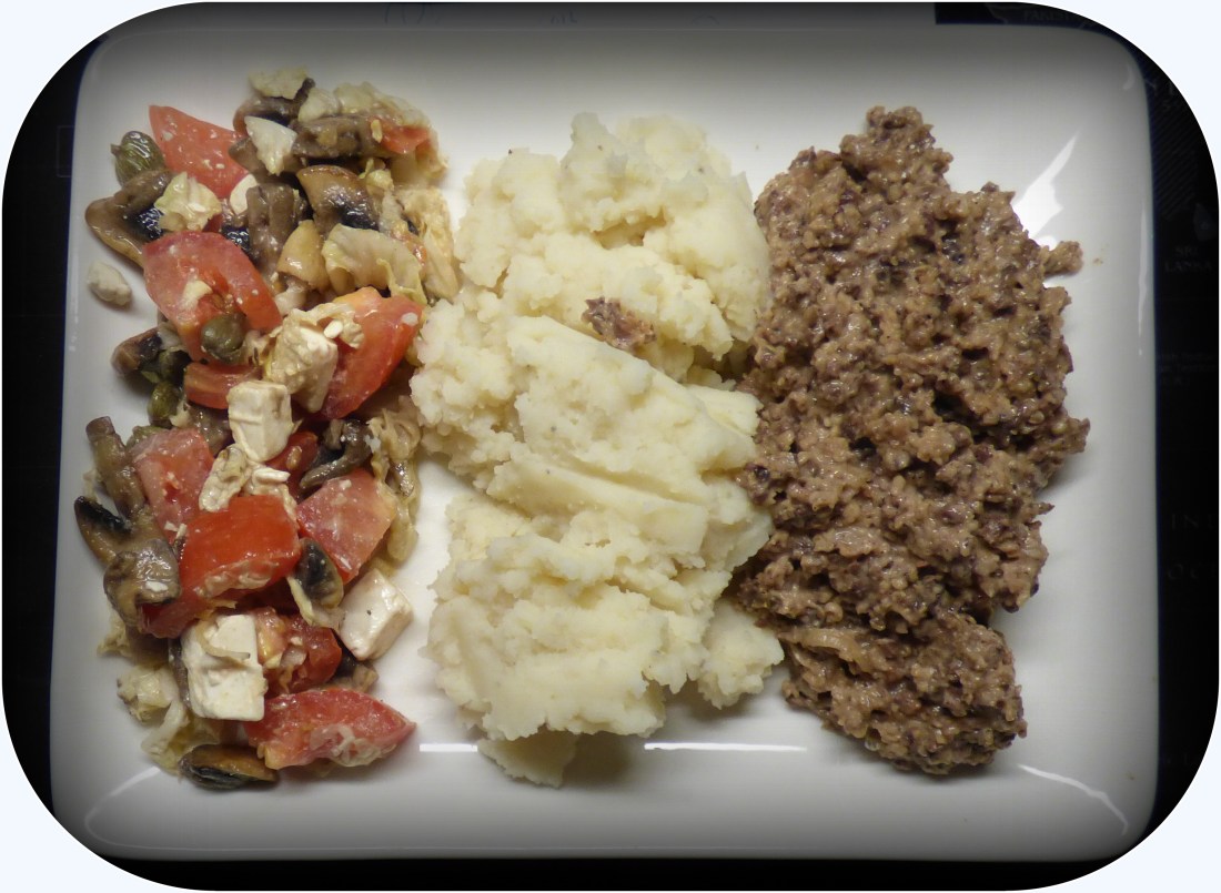 Det blev en rätt som jag ätit kanske ett par gånger tidigare,hos min bror.Men idag var det första gången jag hade rätten på egen tallrik hemma hos mig.. Rätten är Skottlands Nationalrätt ”Haggis” Potatismos och en sallad,tomat,feta,champinjoner,kinakål och kapris..Smakade alldeles utmärkt.Det fick bli en Tjeck i glaset idag,Breznak satt som en smäck.