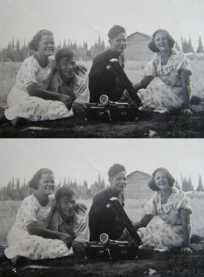 Det regnade skapligt när jag kikade ut i morse,så efter det att jag fixat Dagens Fakta i bloggen,så öppnade jag min mapp ”Släktforskning” kollade igenom och gick in i Riksarkivet,hittade där lite uppgifter som jag kunde föra in i mappen.Kollade igenom lite gamla bilder,en del med ganska dålig skärpa..Började fundera:::Kan man lägga färg på gamla svartvita bilder,,kanske man även kan förbättra skärpan på dom..Ut på nätet för att söka,,jo det fanns program som kunde fixa det också,testade ett program där man kunde prova 10 bilder utan kostnad..Resultatet här nedan på 2 bilder.Före o efter.