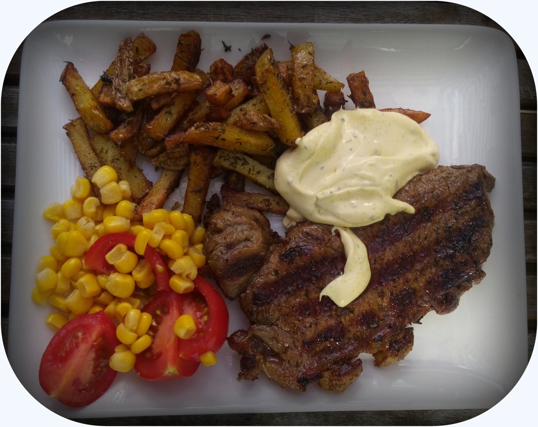 Förberedde dagens mat som skulle bli grillad ryggbiff,hade lite delikatesspotatis som jag gjorde stavar av,skulle råstekas.Biffen kryddade jag på med salt svartpeppar och timjan,brynte på den hastigt i het panna,tog ur biffen och stekte på potatisen i samma panna..Biffen hamnade sedan på grillen,blev några minuter på var sida.På tallriken blev det tomat,majs och bea,,riktigt gott blev det,i glaset den Australiske gentlemannen,perfekt.