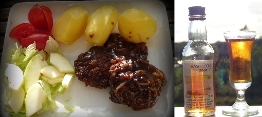 Hade ju en låda från igår med Pannbiff,den fick det bli idag..Var ju till Eskön på förmiddagen,fick då en rejäl Squash av systerdotter Lotta,den lade jag in när jag kom hem,1-2-3 lag chilikryddad..Så när det blev dags att äta så kokade jag potatis,värmde pannbiffen o löksåsen i micron,på tallriken blev det lite tomat, isbergs och squashen,smakade alldeles utmärkt,nästan bättre än igår, Gentlemannen i glaset och dagens nubbe blev en Västgötasnaps gott sörru.