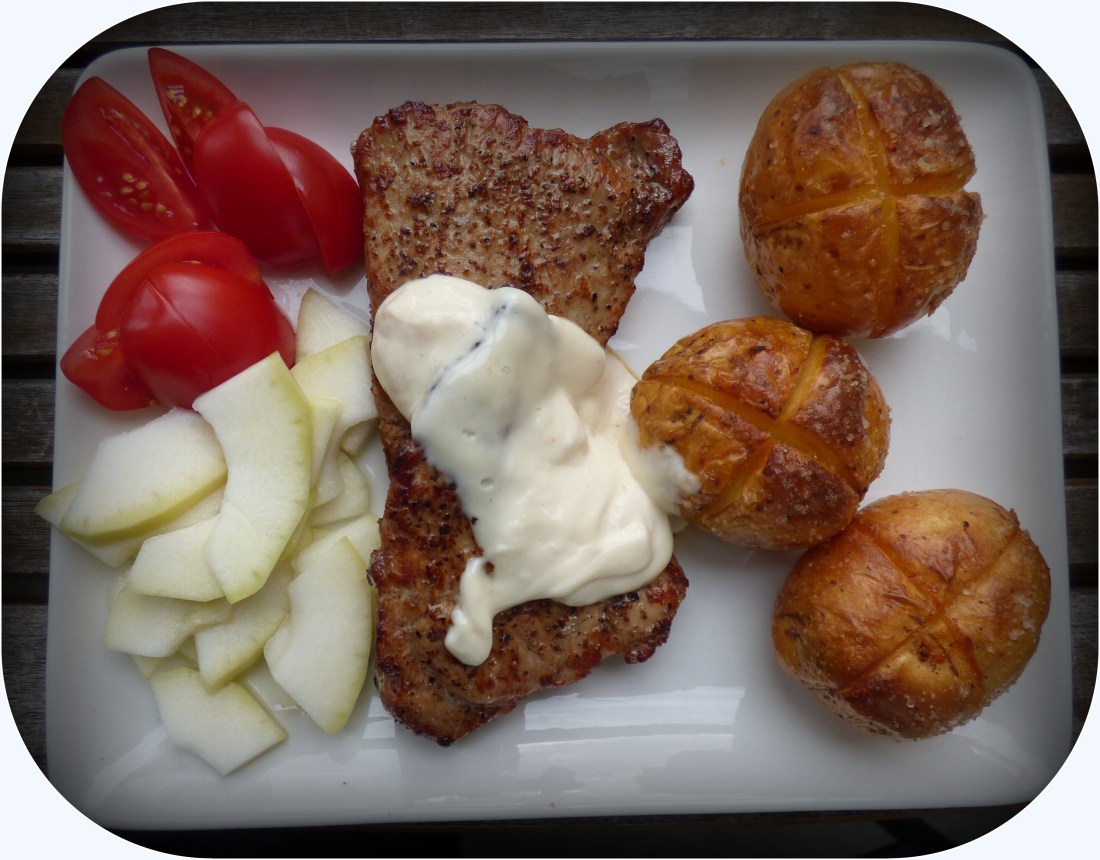 Jag tog fram två skivor av fläskytterfilé,som jag stekte på någon minut per sida,Tog sedan och skar ett kryss i potatisen,inte helt igenom,penslade på lite olivolja och strödde lite havssalt,in i ugnen 225* i ca 30 min,sedan fick köttet gå med i 15 min sänkte värmen till 200*.På tallriken blev det tomat,inlagd squash och ayoli..Smakade riktigt bra..