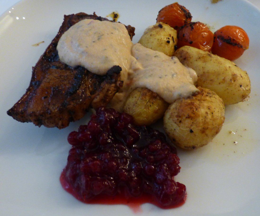 Lammkotlett med ugnstekt potatis och små tomater lingonsylt och en sås gjord på creme fraice och vet inte vad..Riktigt smarrigt.I glaset ett rött höjdarvin.
