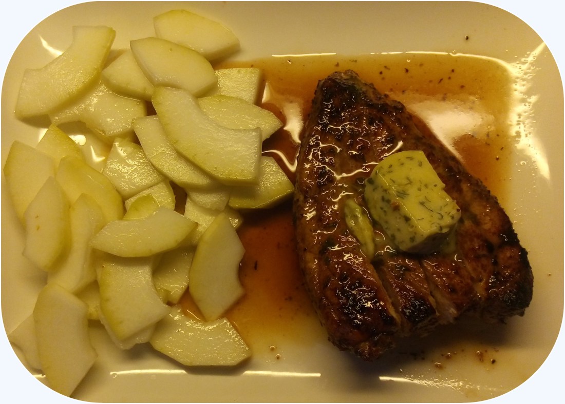 Jag var inte speciellt hungrig idag på em..Det fick bli en bit stekt fläskytterfilé med persiljesmör och inlagd squash,smakade riktigt bra..