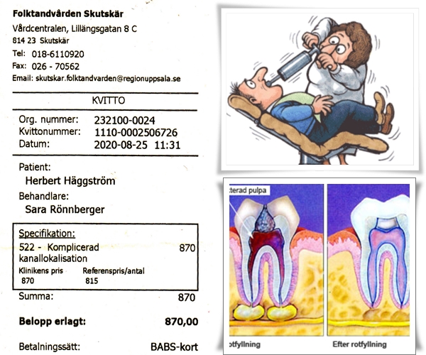 Jag hade tid hos Folktandvården idag,det skulle förberedas för en rotfyllning av en kindtand,,kanalerna i roten var väldigt smala,så det var besvärligt att finna dom,krävdes att tandläkaren måste använda mikroskop.Efter 1:15 timme var det rensat och klart,provisoriskt lagat nu,nästa besök blir 6/10 Då blir det fyllning..Gissa om jag var trött i käken efter detta långa gapande,Men min tandläkare Sara är helt fantastisk..Tandläkaren jag hade 1950 vill jag minnas påminde om den på bilden,Huvaligen..
