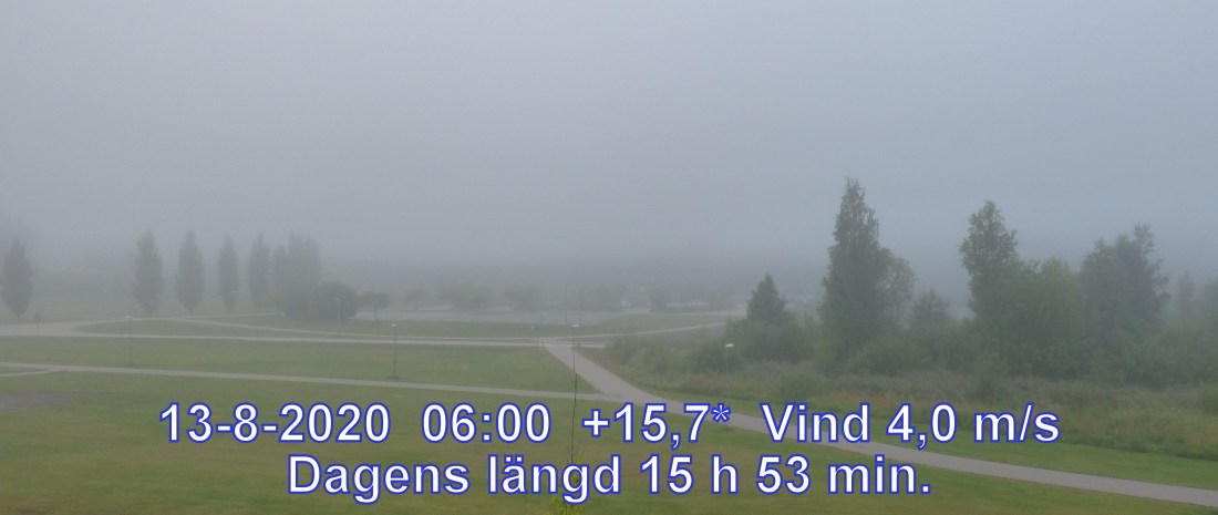 +16 °C Vind 4,0 m/s Känns som +15° Daggpunkt +16° Fuktighet 99.4% Soluppgång 04:57 Solnedgång 20:50 Dagens längd 15 h 53 min.