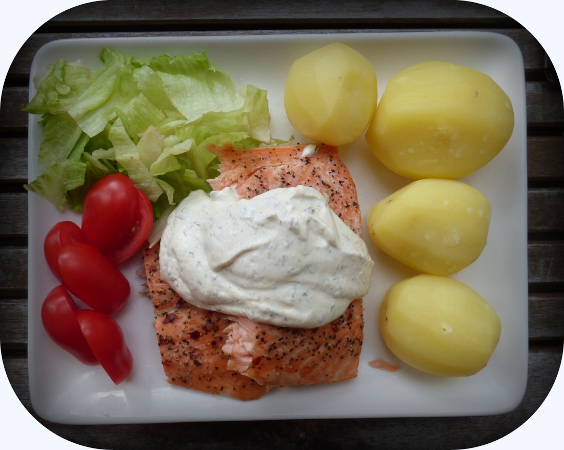 På tallriken lite grönt sallad,tomat,potatis och en romsås gjord på creme fraice, och dill.Smakade alldeles utmärkt.