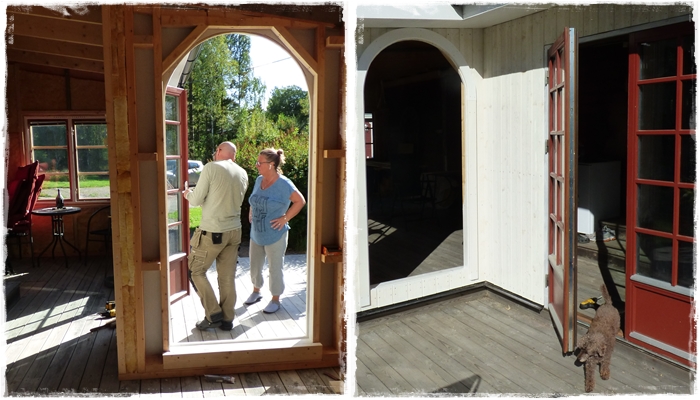 Tog en liten tur till Eskön även denna lördag,har nästan blivit en tradition nu..I Bladmyra 19 var det dörrjobb på gång.Lås skulle monteras på dubbeldörren,och det stora välvda fönstret ska på plats.Doris ville vara med på den högra bilden