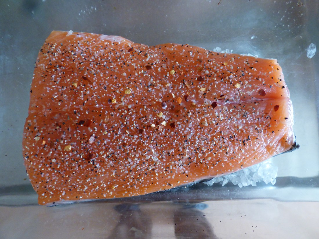 Varför kanske någon undrar,,jo trots den lite svala eftermiddagen så satt jag ute på balkongen och intog dagens middag.Det såg lite regnsjukt ut och vinden rufsade om i håret,+15 grader krävde tunn jacka på..Men nu,,vad fanns på tallriken..Jo lax tillagade på saltbädd i ugnen,krydda salt, citronpeppar, och chiliflakes.Ugn på 200* i 12 min,perfekt