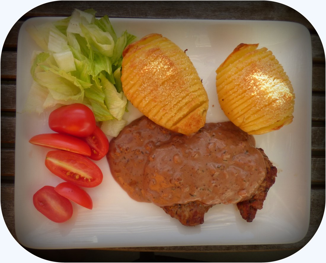 Kändes riktigt skönt ute på em,så det blev till att duka på balkongen,+17 grader räcker för att äta ute..Det blev Fläskfilé,timjansås hasselbackpotatis och lite grönt,,även idag fick det bli Ramos,den röda Portugisen i glaset.Smakade bra.