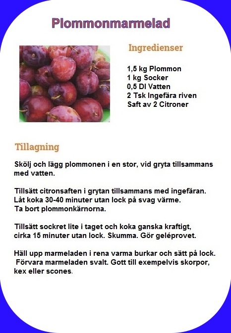 Första gången som jag försökte mig på att koka Plommonmarmelad.Jag fick några kilo plommon häromdagen av goda vänner Lasse och Inger,hon hade kokat en omgång,jag fick smaka,och jädrar så gott det var.När jag åkte hem så hade jag både recept och plommon..Idag tog jag mod till mig,att koka plommonen..Receptet var på 1,5 kg plommon,jag delade på det,nöjde mig med hälften 7,5 hg.