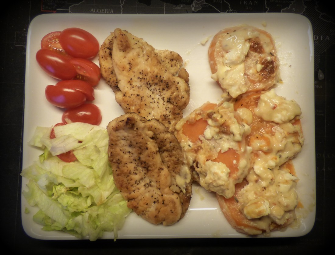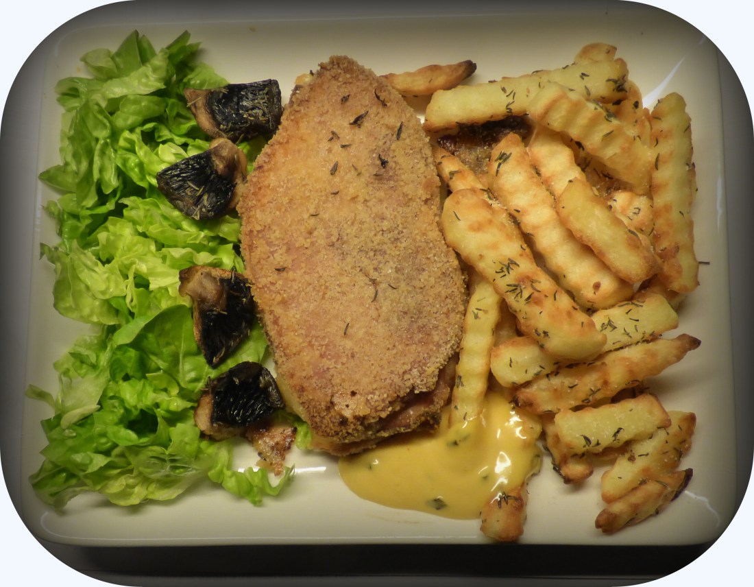 Jag köpte en liten färdigkokt skinka i veckan,(lite julfeeling).Det mesta av den blev smörgåsmat..Men jag skar några skivor 5-6 mm tjocka,det blev 6 st,jag parade ihop dom 2 och 2,lade en skiva ost och lite rökt skivad skinka imellan.Vände sedan bitarna i ägg och ströbröd,sedan in i ugnen 180* i ca 25 min.På tallriken blev det pommes mango raijasås en klyftad stekt champinjon och lite grönt.Riktigt jäkla gott vill jag lova..