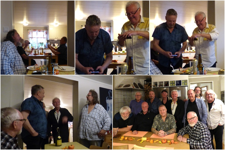 Så var det dags igen för den traditionella gubbamiddagen,säkert den 10:e i ordningen.Menyn var ..Förrätt Ägg och Anjouvis på kavring..Varmrätt Inkokt lax potatis dillmajo knäcke smör ost..Efterrätt rulltårta färska bär grädde kaffe och konjak..Och som grädde på moset en massa anekdoter från gubbarnas turnerande,med storheter som Björn Skifs och Jerry Williams och inte minst Claes Jansson..Tack Micke och Anette..