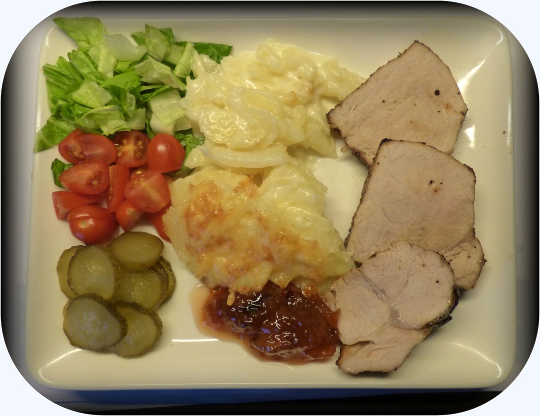 Hade en bit fläskytter i frysen som jag tog fram i morse,när den tinat så kryddade jag på rejält med salt,svartpeppar och timjan,brynte sen på den runt om i het panna.Hade en färdig gratäng som fick gå in i ugnen samtidigt som köttet,körde köttet till 67 grader,tog ut köttet som fick vila därför att gratängen behövde ca 10 min extra..På tallriken blev det som vanligt sallad,tomat,gurka och lite plommonkompott.Smakade utmärkt.