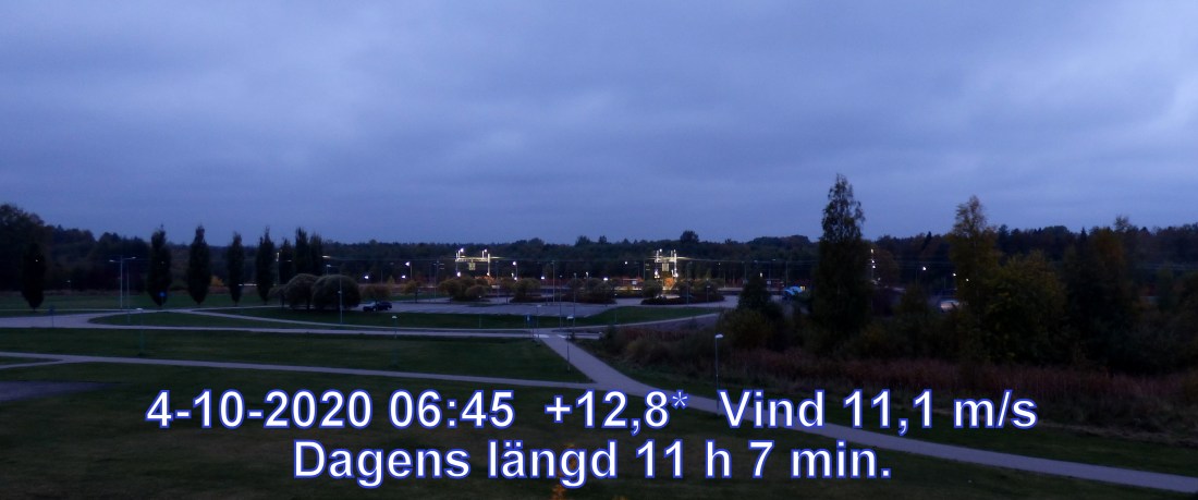 +12 °C Vind 11,1 m/s Soluppgång 07:04 Solnedgång 18:11 Dagens längd 11 h 7 min.
