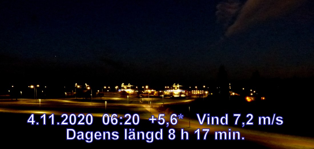+7 °C Vind 7,2 m/s Soluppgång 07:24 Solnedgång 15:41 Dagens längd 8 h 17 min.