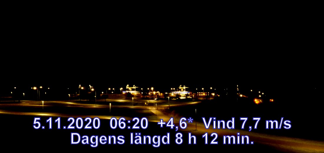 +5 °C Vind 7,7 m/s Soluppgång 07:27 Solnedgång 15:39 Dagens längd 8 h 12 min.