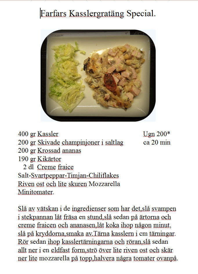 Kollade i skåpet vad som fanns,när jag kom hem från Uppsala,en liten bit kassler 400 gr,den tar vi sa mitt huvud,hade en burk skivade champinjoner,den tar vi sa mitt huvud,en liten frp kikärtor fanns,den tar vi sa mitt huvud,en liten burk krossad ananas,den tar vi sa mitt huvud,en burk 2 dl creme fraice,den tar vi sa mitt huvud,lite riven ost och en halv mozzarellaost,den tar vi sa mitt huvud..Hur jag gjorde har jag noterat nedan.Smakade riktigt bra..
