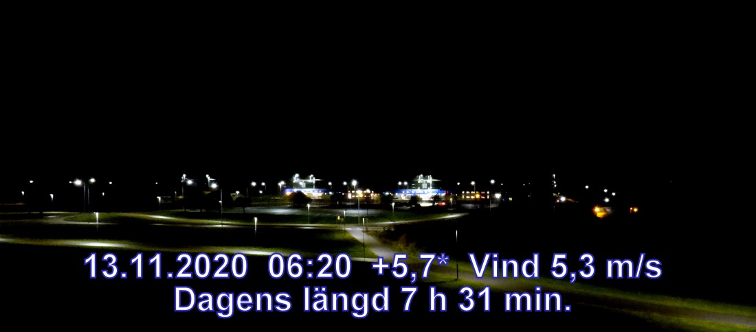 +6 °C Vind 5,3 m/s Soluppgång 07:48 Solnedgång 15:19 Dagens längd 7 h 31 min.