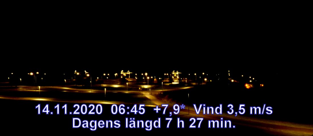 +7 °C Vind 3,5 m/s Soluppgång 07:50 Solnedgång 15:17 Dagens längd 7 h 27 min.