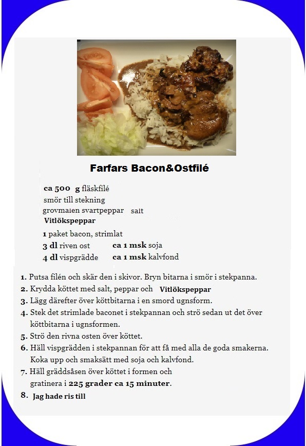 Ja det blev fläskfilé på nytt sätt i ugnen,hade läst ett recept någonstans minns inte var..Men kom ihåg att det var med ost och bacon..Jag kör ur minnet.Blev riktigt bra.Gissar att detta mättar 4 Pers.