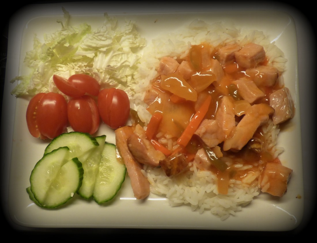 Kan det bli bra,,klart det kan,tycker jag i alla fall..Jag skar ner en bit kassler i mindre bitar,som fick landa i stekpannan tillsammans med innehåller i en burk Uncle Bens sweet & soursås.Riskoket är på G,snart klart.Laddar tallriken med lite tomat,kinakål och gurka..Enkelt men det smakade riktigt bra.