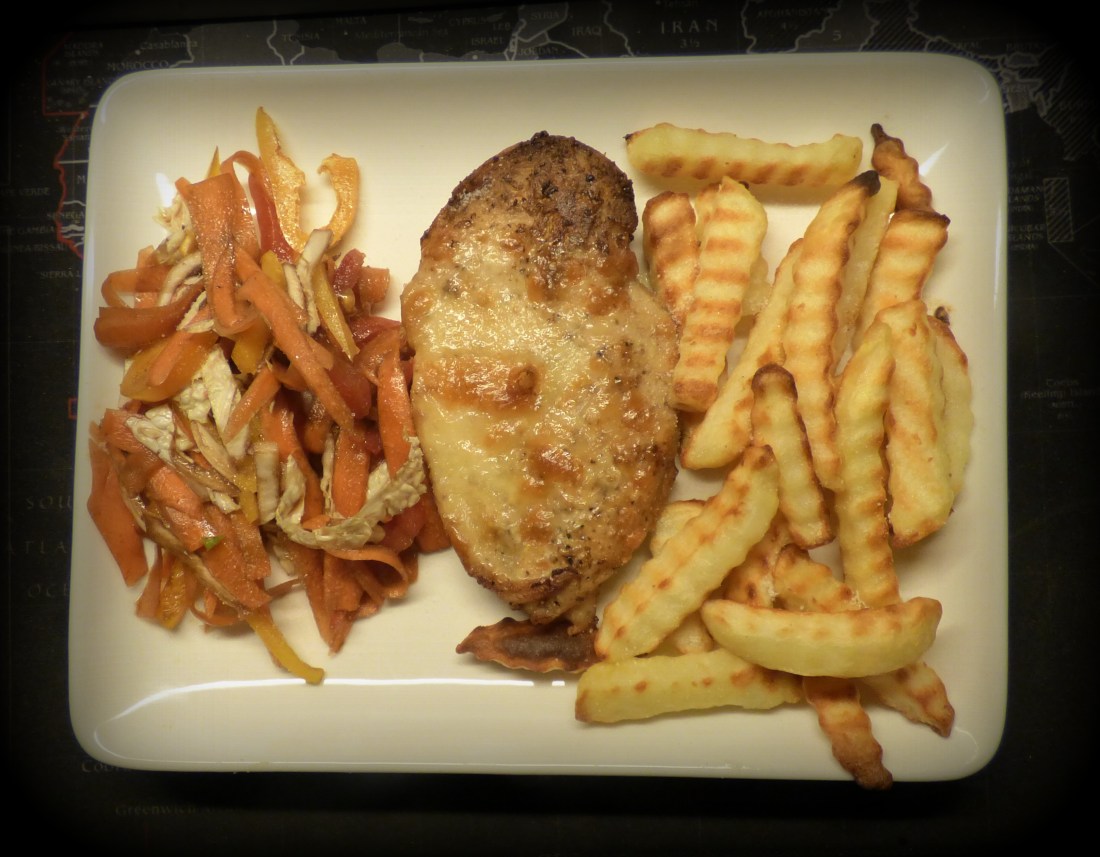 Idag blev det en favorit i repris,första gången jag åt en liknande rätt var på Restaurang Passagio Aya Napa Cypern.Jag försökte laga till kycklingfilé så som jag minns den,,lyckades ganska bra.Brynte på kycklingbröstet som jag kryddat på med salt och svartpeppar.Lade sedan kycklingeg i en form lade på en bit mozarellaost,sedan in i ugnen där redan pommesen låg,satte uret på 20 min.Strimlade lite morot,paprika,kinakål och tomat utan fröhuset..Ringlade över lite olivolja och Balsamvinäger..I glaset hade jag den Australiske röda Gentlemannen…Vill nästan påstå att det är tjänstefel att inte prova detta.