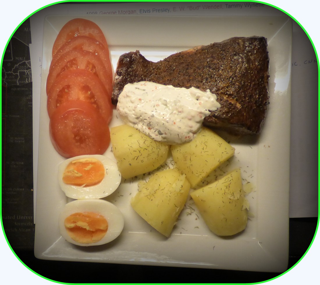 Rökte en bit lax som blev dagens goäta,på tallriken,kokt potatis,ägg,romsås och tomat..Riktigt gott blev det..