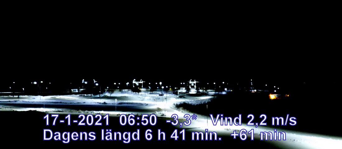 -2 °C Vind 2,2 m/s Soluppgång 08:40 Solnedgång 15:21 Dagens längd 6 h 41 min.