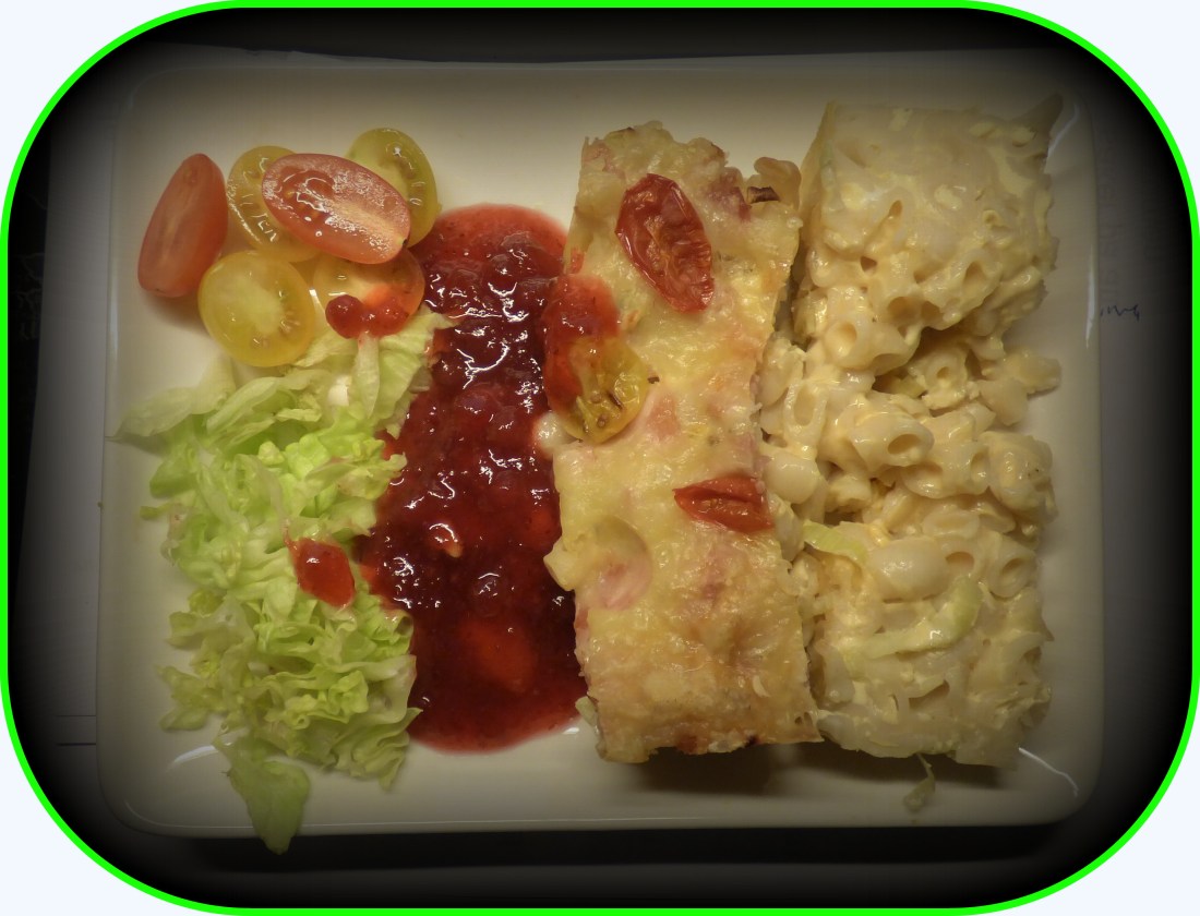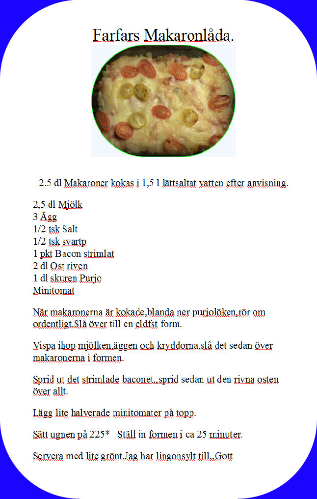 Jag satte ihop ett recept på en Makaronlåda idag,blev väl inte så tokigt.Den hade nog blivit perfekt om jag haft annan riven ost än mozarella,nästa gång ska jag använda gratängost,då blir den säkert bättre.Jag äter ju gärna makaronpudding eller låda med lingonsylt..Sonen säger att det funkar inte,men han har aldrig provat,så jag bryr mig inte om vad han säger..Hade lite grönt å.