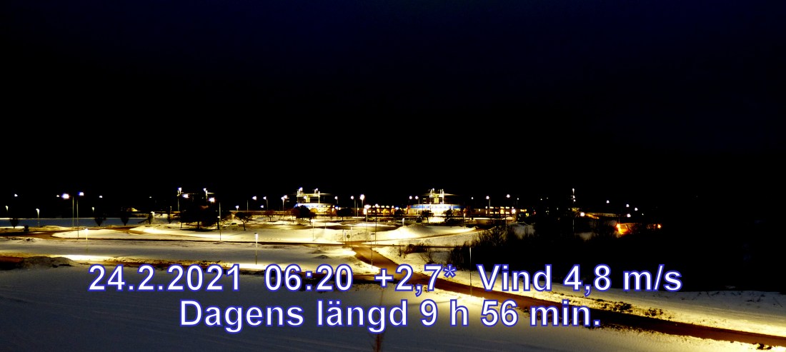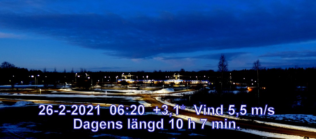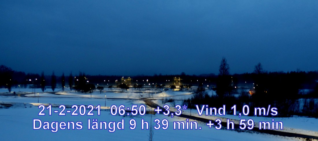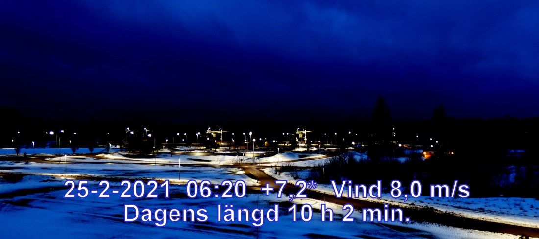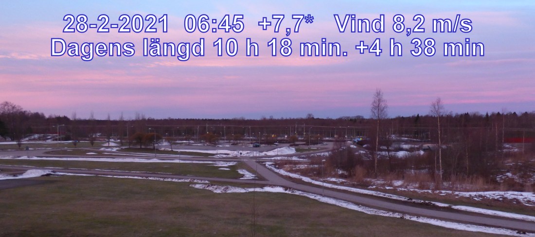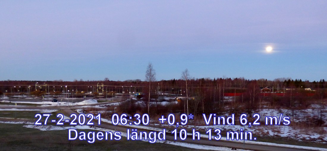 +6 °C Vind 8,2 m/s Soluppgång 06:54 Solnedgång 17:12 Dagens längd 10 h 18 min.