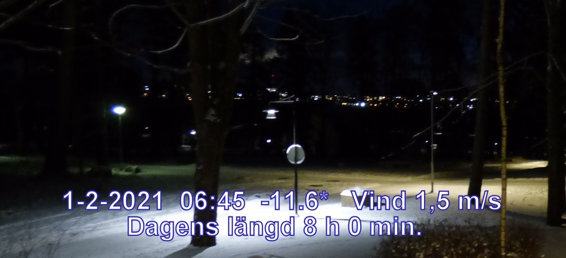 -13 °C Vind 1,5 m/s Klart och uppehållsväder Soluppgång 08:03 Solnedgång16:03 Dagens längd 8 h 0 min.