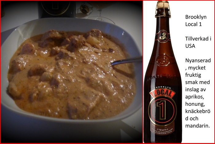 Idag måndag 1 Mars så bjöd sonen på en gårdagens rätt,som smakade så bra då,men som inte hamnade på bild..Men det räckte till en tallrik till mig idag.En jättegod fläskfilégryta,men en massa godsaker i,lammkorv,syltlök,morot och lingonsylt,säkert något mer också som jag inte har kläm på.I glaset fick jag en öl från Usa Brooklyn Lokal 1 som var riktigt god och som verkligen var en starköl 9,5 %,blev lite svettig i pannan,det var drag i filégrytan så ock i ölen..