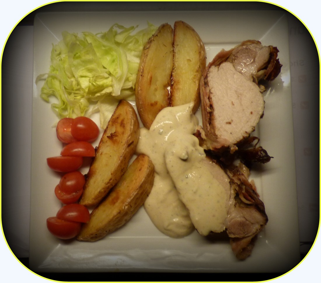 Idag blev det en bit baconlindad fläskytterfilé,med klyftpotatis,min kalla greksås och lite grönt.Riktigt mätt o belåten är jag nu..