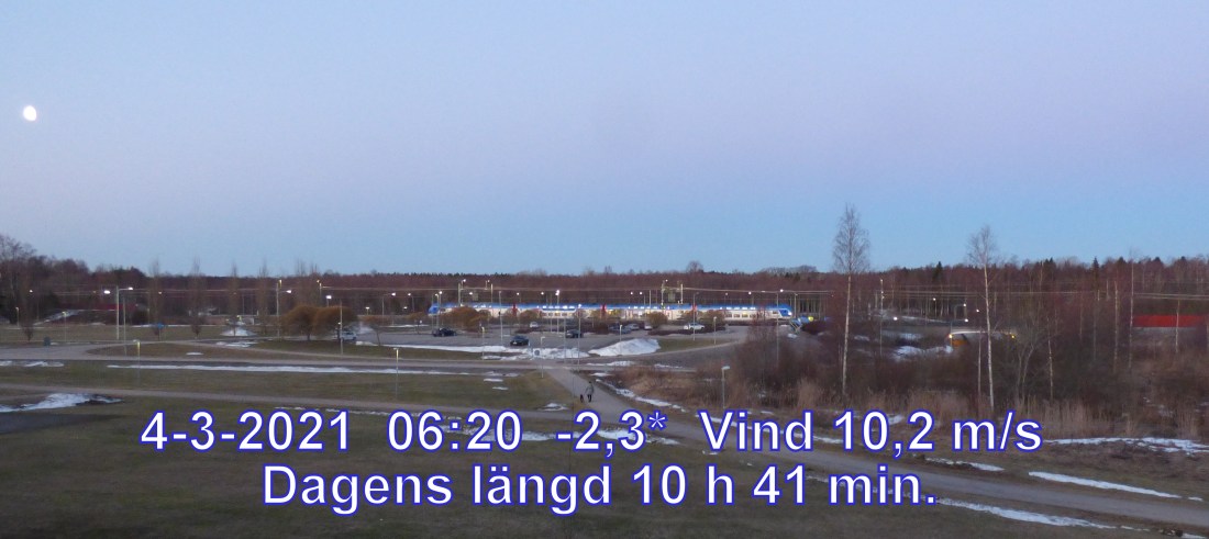 0 °C Vind 10,2 m/s Soluppgång 06:42 Solnedgång 17:23 Dagens längd 10 h 41 min.